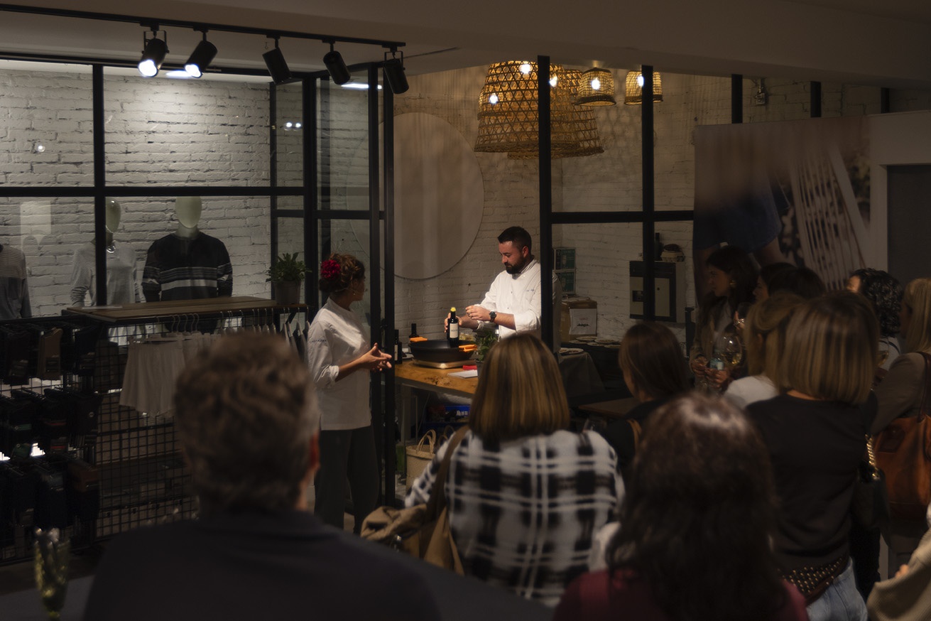 El evento giró en torno a esta idea de confort elegante. Mientras la chef y su equipo elaboraban en directo una cena-cóctel, los asistentes pudieron degustar cada plato tras una explicación detallada de las recetas, ingredientes y trucos culinarios. El toque dulce corrió a cargo de David del Campo, que puso el broche final con un postre de autor maridado con aceite Aüra, cervezas Mortiz y ratafía de L’Hostia. Un menú de diez para acompañar una colección no menos sobresaliente.