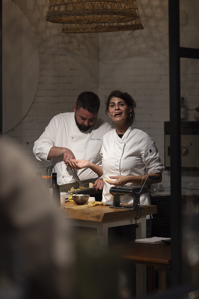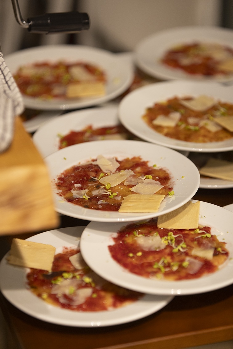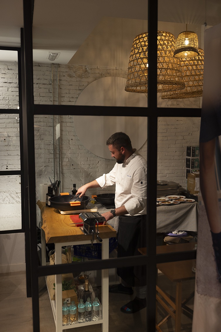El evento giró en torno a esta idea de confort elegante. Mientras la chef y su equipo elaboraban en directo una cena-cóctel, los asistentes pudieron degustar cada plato tras una explicación detallada de las recetas, ingredientes y trucos culinarios. El toque dulce corrió a cargo de David del Campo, que puso el broche final con un postre de autor maridado con aceite Aüra, cervezas Mortiz y ratafía de L’Hostia. Un menú de diez para acompañar una colección no menos sobresaliente.
