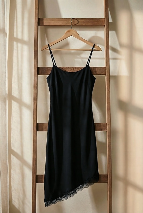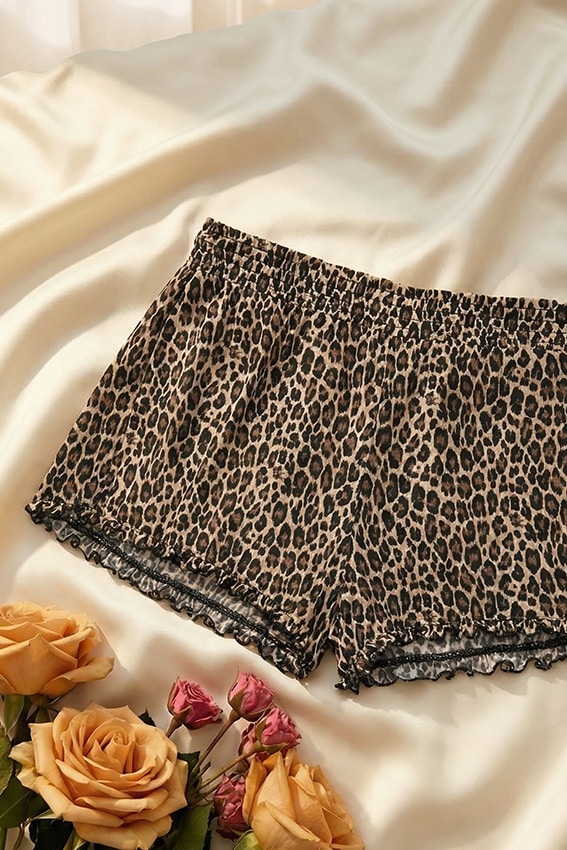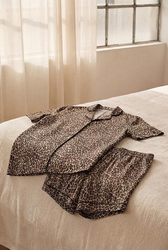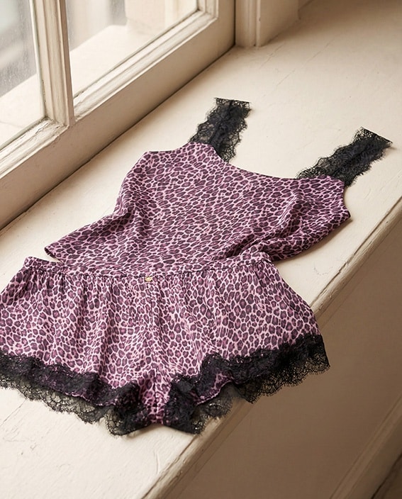 La colección de lencería se completa con un conjunto de top y culotte con estampado animal en tonos morados y negros contrastados, junto con un vestido lencero asimétrico, todos confeccionados en satén de viscosa con Lenzing™ Ecovero™ y encaje.