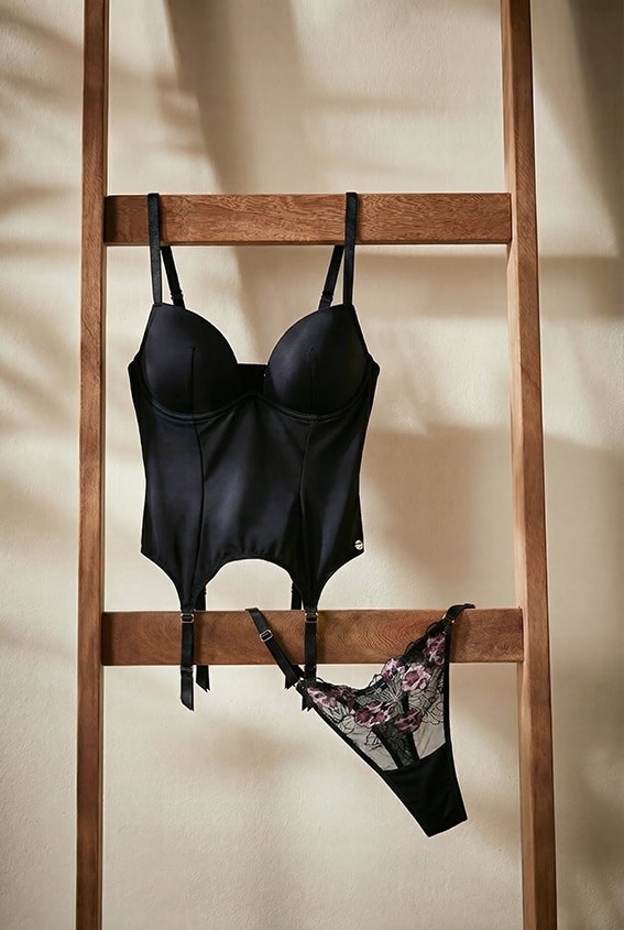 En cuanto a la colección lencera para ellas, dos propuestas: una romántica y femenina, diseñada para aportar un toque de sensualidad al look y otra de líneas más básicas, pensadas para el uso diario. Entre las prendas, un sujetador balconette, un push-up, un body, braguitas brasileñas y tanga, todos confeccionados con un ribete de encaje con bordados en forma de mariposa y estampados de animales en contraste, tul elástico y detalles de satén. Además, un body acolchado en charmeuse brillante con acabado efecto satén, con un liguero decorativo.